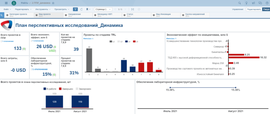 Portfolio and Project management dashboards with the TRL indicators, project costs, economic effects